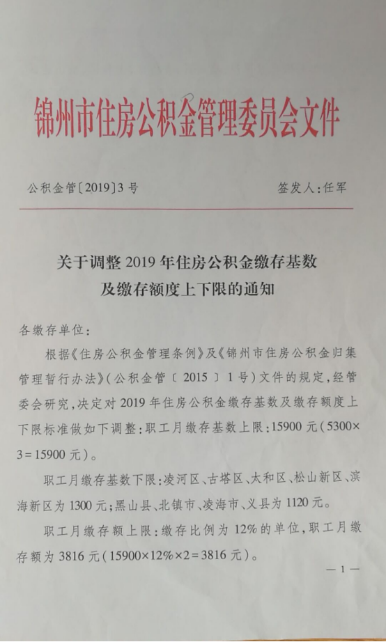 关于调整2019年住房公积金缴存基数及缴存额度上下限的通知(锦州)