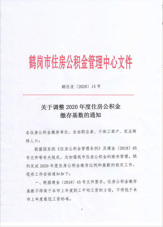 关于调整2020年度住房公积金缴存基数的通知(鹤岗)