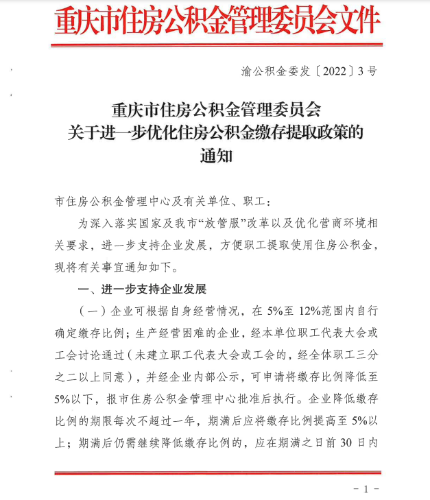 重庆市住房公积金管理委员会关于进一步优化住房公积金缴存提取政策的通知