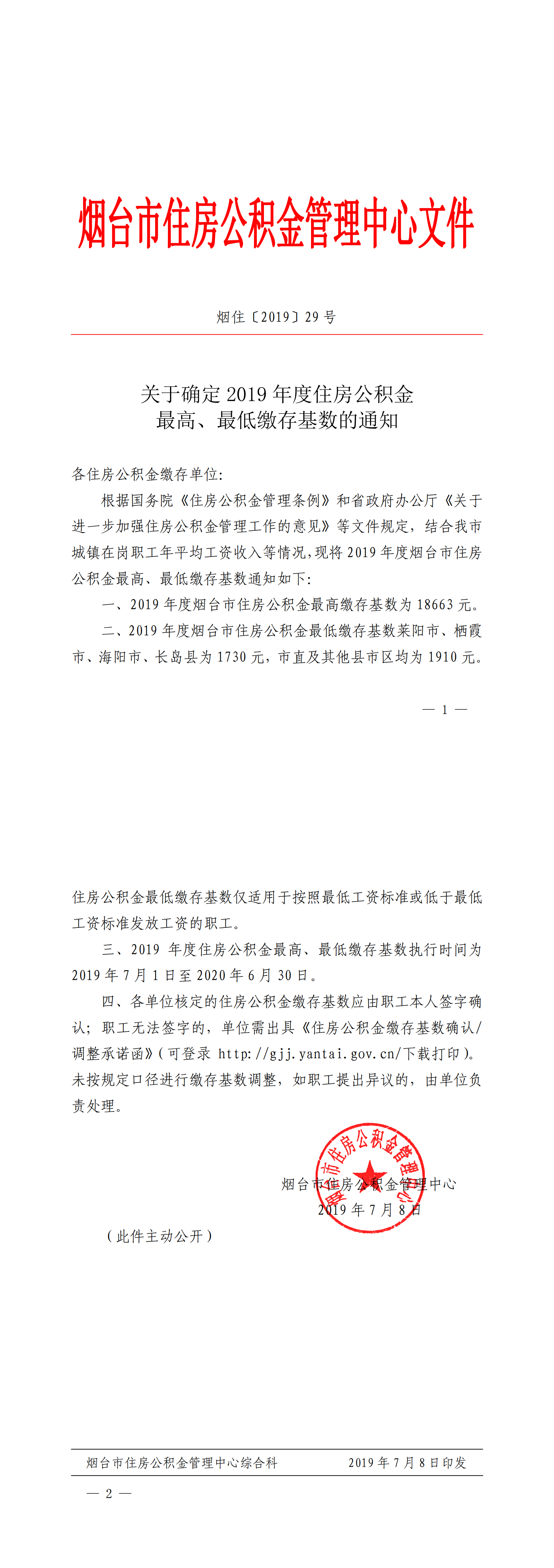 关于确定2019年度住房公积金最高、最低缴存基数的通知(烟台)