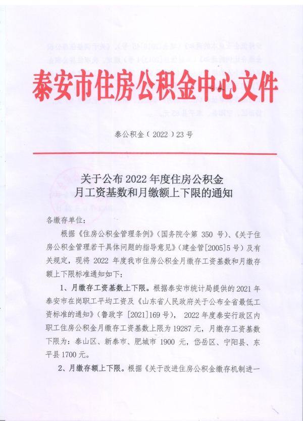 关于公布2022年度住房公积金月工资基数和月缴额上下限的通知(泰安)