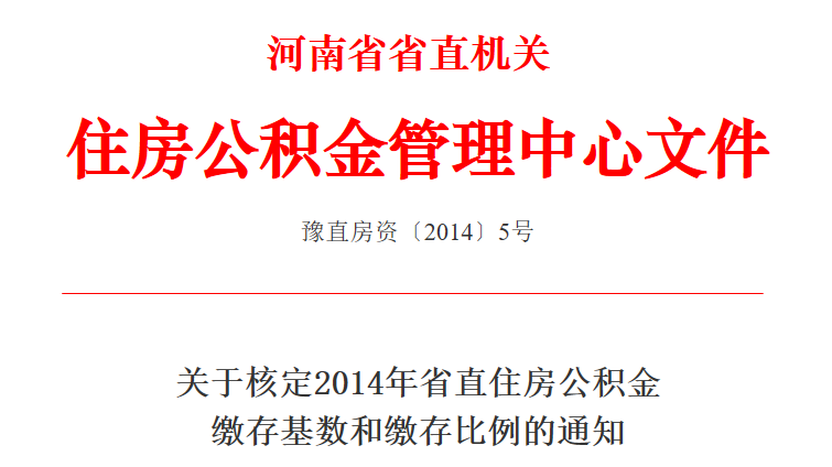 根据《河南省住房公积金管理条例》和《关于住房公积金管理若干具体问题的指导意见》(建金管[2005]5号)精神,现将2014年度省直住房公积金缴存基数和缴存比例等有关事项通知如下: