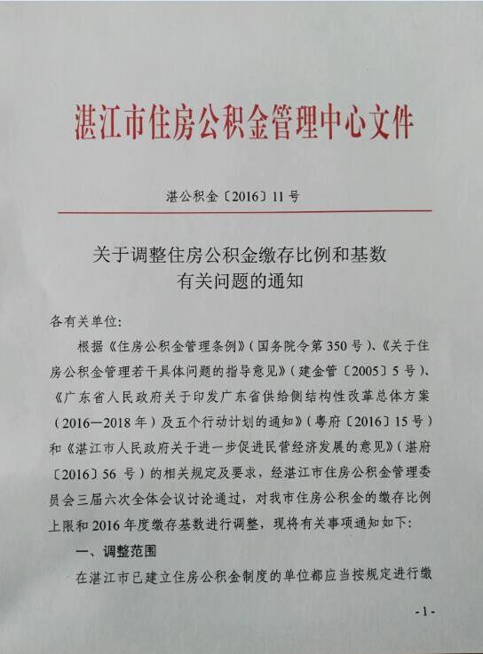 根据《住房公积金管理条例》(国务院令第350号)、《关于住房公积金管理若干具体问题的指导意见》(建金管〔2005〕5号)、《广东省人民政府关于印发广东省供给侧结构性改革总体方案(2016—2018年)及五个行动计划的通知》(粤府〔2016〕15号)和《湛江市人民政府关于进一步促进民营经济发展的意见》(湛府〔2016〕56 号)的相关规定及要求,经湛江市住房公积金管理委员会三届六次全体会议讨论通过,对我市住房公积金的缴存比例上限和2016年度缴存基数进行调整,现将有关事项通知如下: