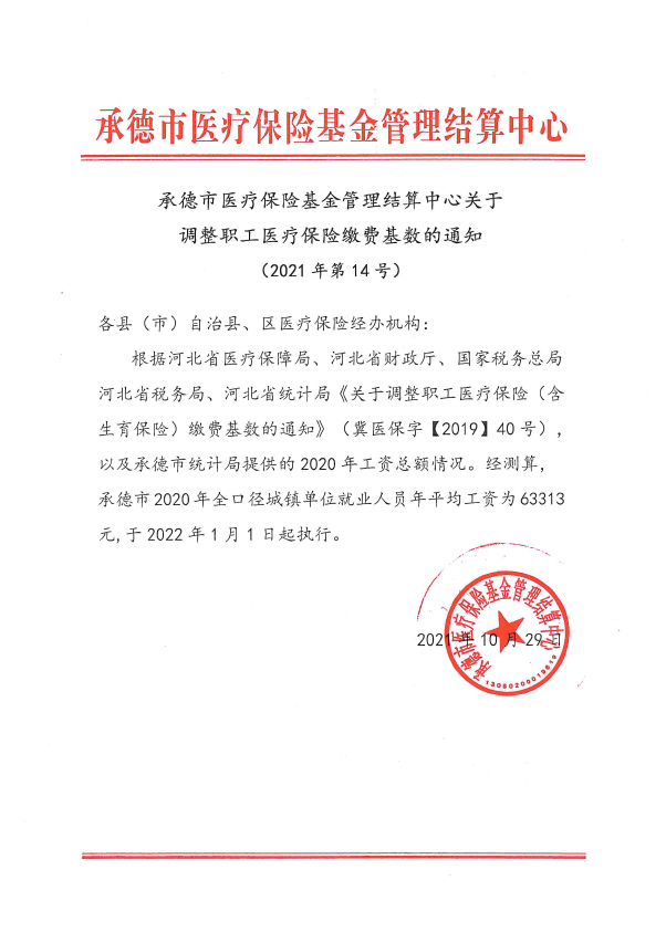 承德市医疗保险基金管理结算中心关于调整职工医疗保险缴费基数的通知(2022)