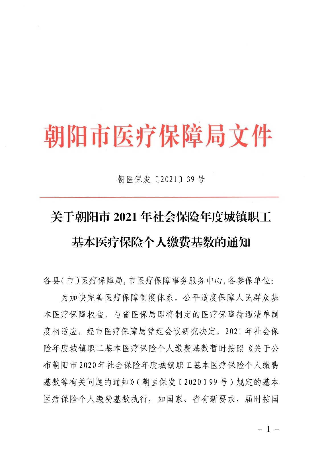 关于朝阳市2021年社会保险年度城镇职工基本医疗保险个人缴费基数的通知