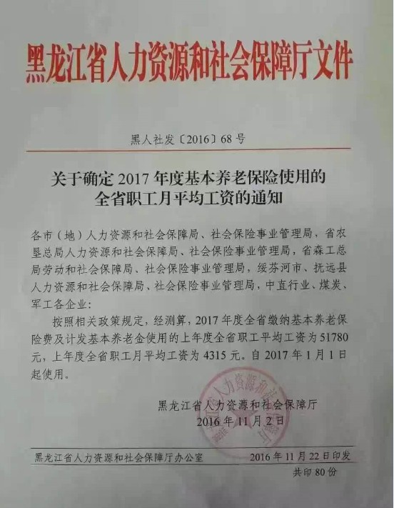 关于确定2017年度基本养老保险使用的全省职工月平均工资的通知(黑龙江)