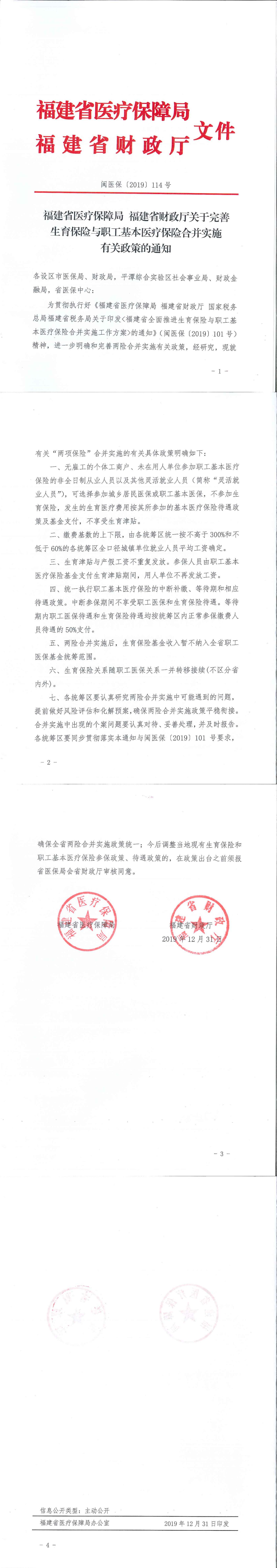 福建省医疗保障局 福建省财政厅关于完善生育保险与职工基本医疗保险合并实施有关政策的通知.pdf