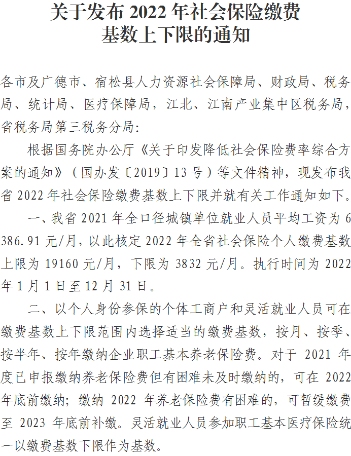 关于发布2022年社会保险缴费基数上下限的通知(蚌埠)