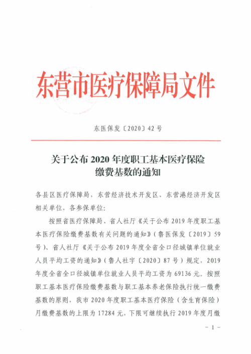 关于公布2020年度职工基本医疗保险缴费基数的通知(东营)
