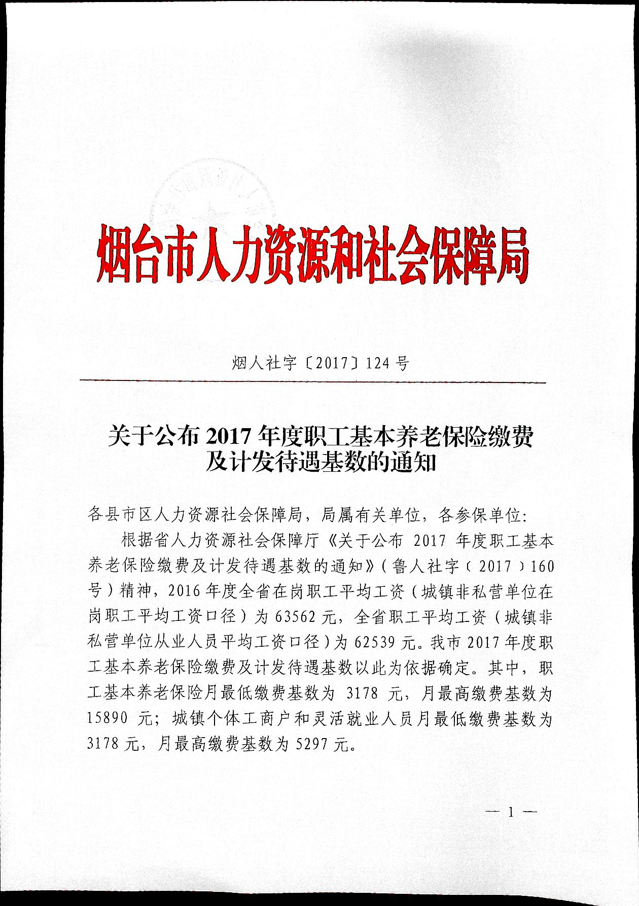 关于公布2017年度企业职工基本养老保险缴费及计发待遇基数的通知(烟台)