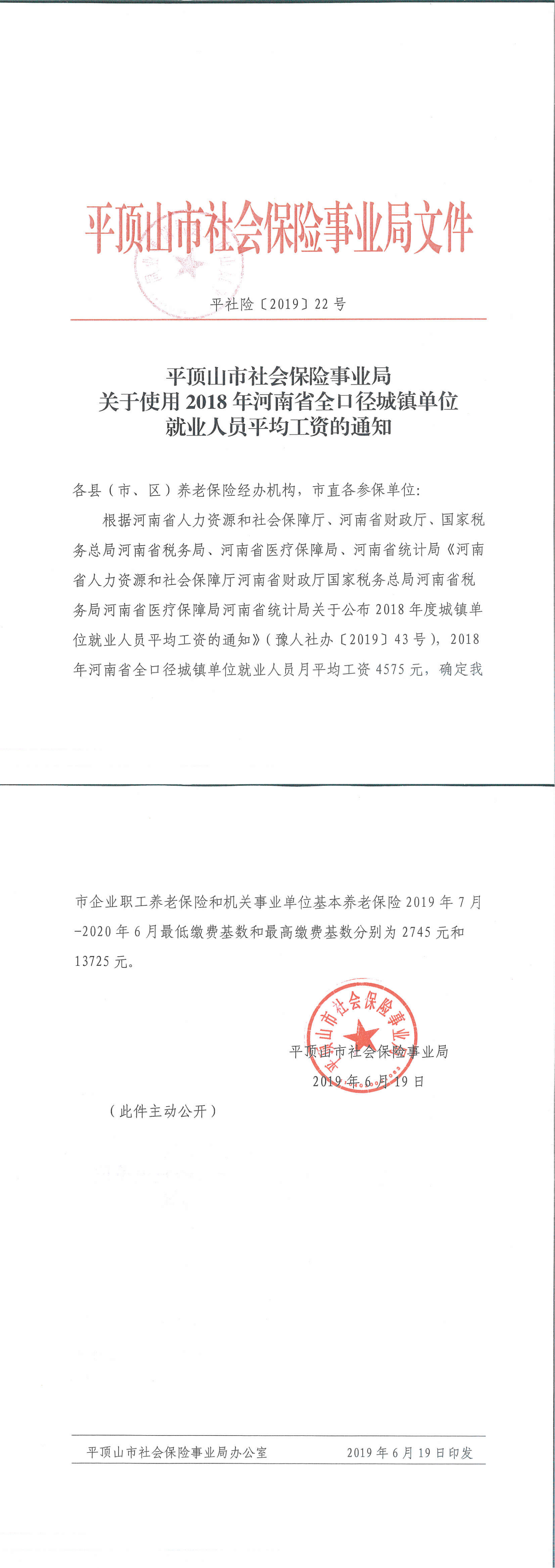 2019年7月-2020年6月缴费基数(2018年河南省全口径城镇单位就业人员平均工资)的通知(平顶山)