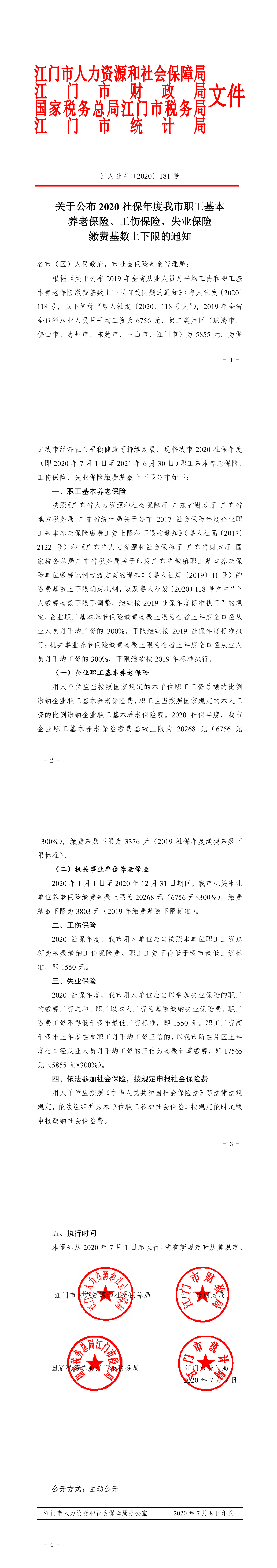 关于公布2020社保年度我市职工基本养老保险、工伤保险、失业保险缴费基数上下限的通知(江门)