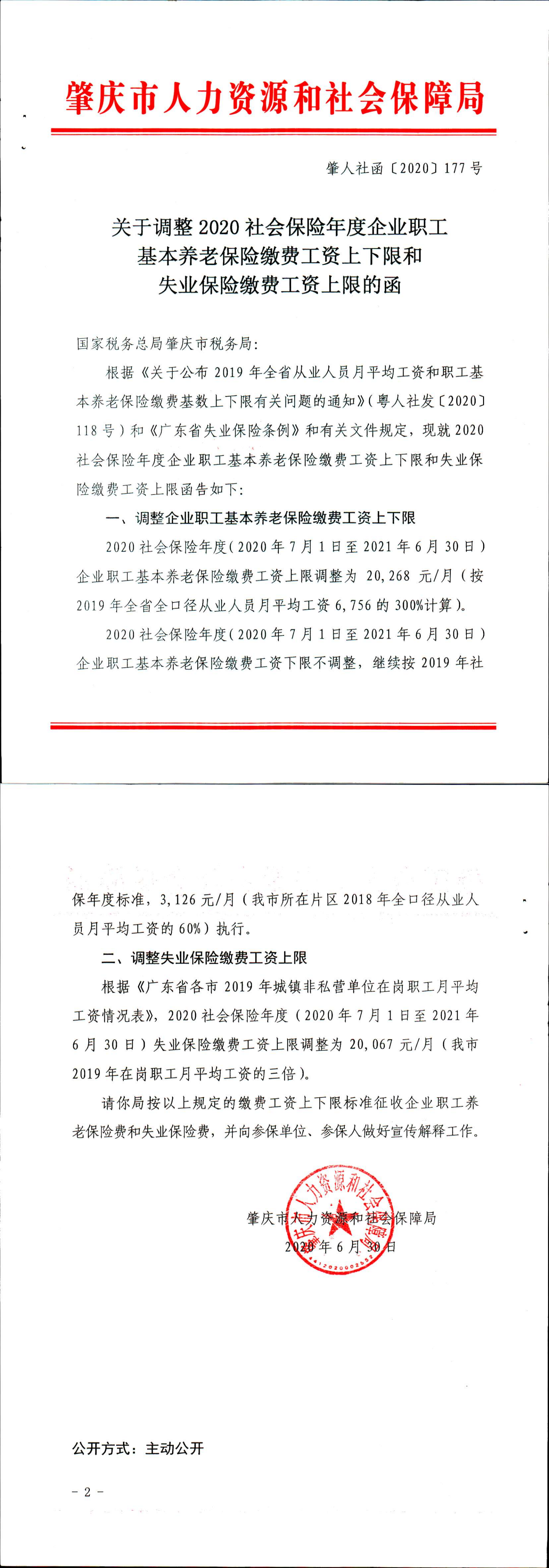 关于调整2020年社会保险年度企业职工基本养老保险缴费工资上下限和失业保险缴费工资上限的函(肇庆)