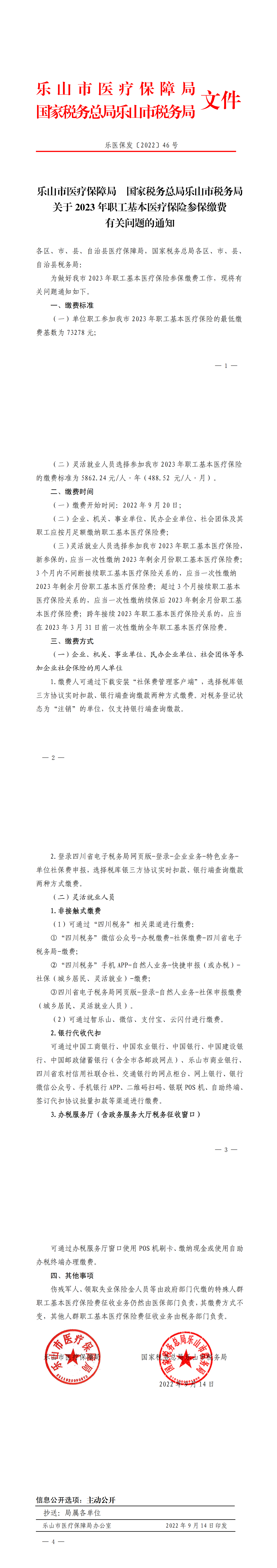 乐山市医疗保障局 国家税务总局乐山市税务局 关于2023年职工基本医疗保险参保缴费有关问题的通知