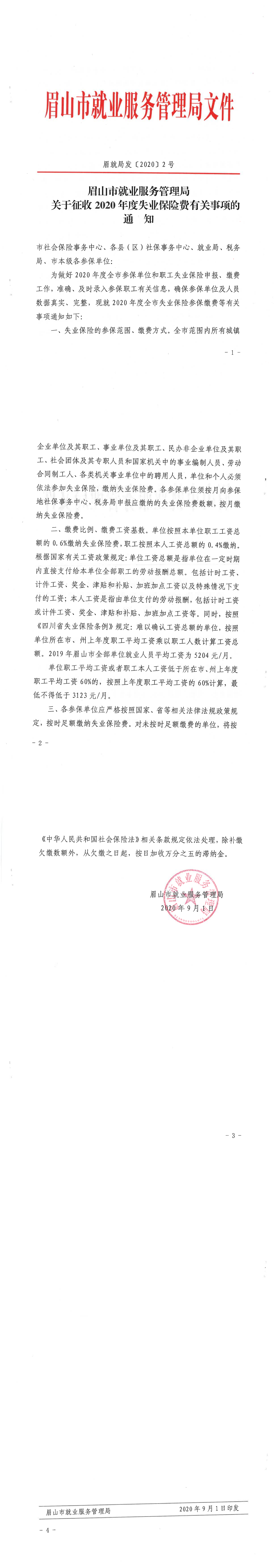 眉山市就业服务管理局关于征收2020年度失业保险费有关事项的通知