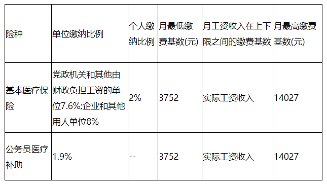 按照《关于明确生育保险和职工基本医疗保险合并实施有关问题的通知》(雅医保发〔2019〕19号)要求,生育保险基金并入职工基本医疗保险基金,市级统筹,统一征缴,统一缴费基数。党政机关和其他由财政负担工资的单位参加职工基本医疗保险按照本单位职工上年或上月工资总额的7.6%(含生育保险费率0.1%)缴纳,公务员医疗补助费率为1.9%。企业和其他用人单位参加职工基本医疗保险按照本单位职工上年或上月工资总额的8%(含生育保险费率0.5%)缴纳。最低缴费基数为上年度全口径省平工资的65%,最高缴费基数为上年度全口径省平工资的243%。在职职工个人按核定缴费基数的2%缴纳基本医疗保险费,由用人单位按月代扣代缴。单位退休人员补缴标准按《雅安市城镇职工医疗保险实施细则》(雅人社发〔2015〕36号)执行。