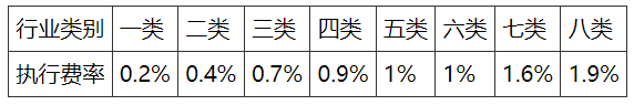 一至八类行业工伤保险基准费率分别为0.2%、0.4%、0.7%、0.9%、1.1%、1.3%、1.6%、1.9%。全市参保单位按照新公布的《工伤保险行业风险分类表》重新进行分类划分,不同工伤风险类别的行业执行不同的工伤保险行业费率。