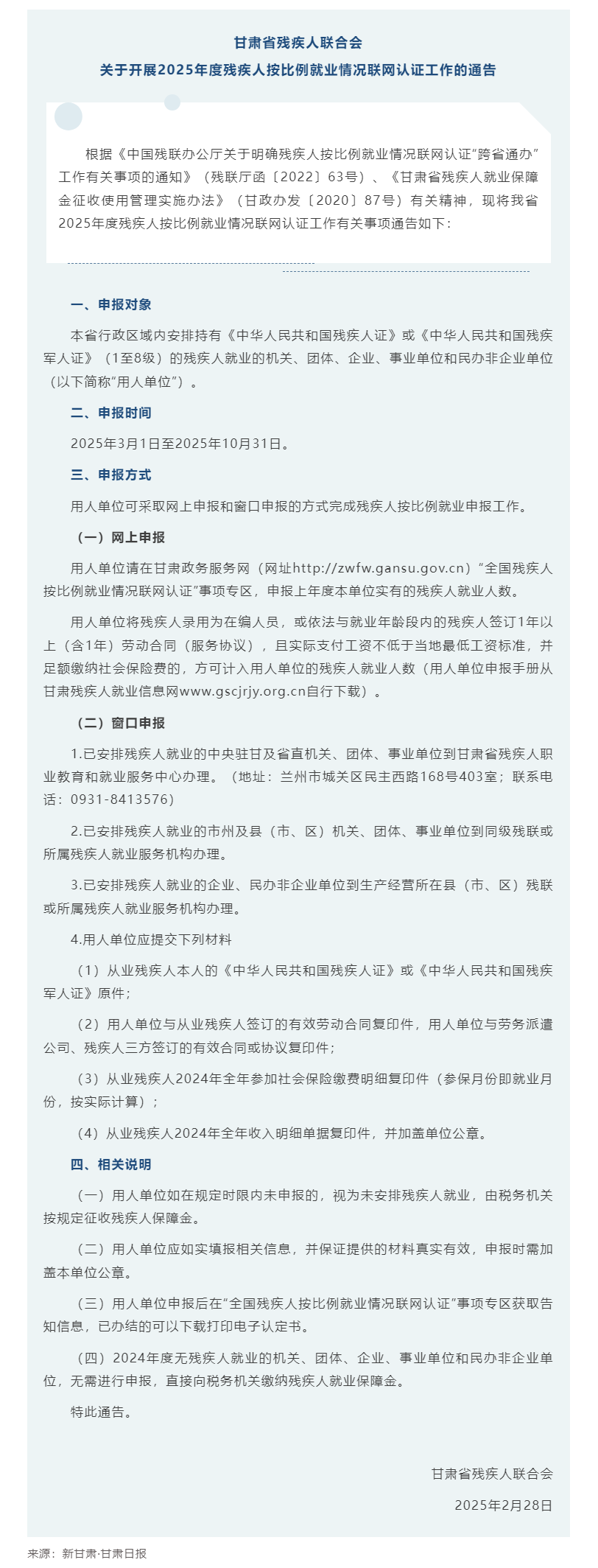 甘肃省残疾人联合会关于开展2025年度残疾人按比例就业情况联网认证工作的通告