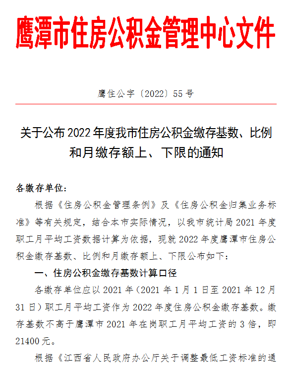 关于公布2022年度我市住房公积金缴存基数、比例和月缴存额上、下限的通知(鹰潭)