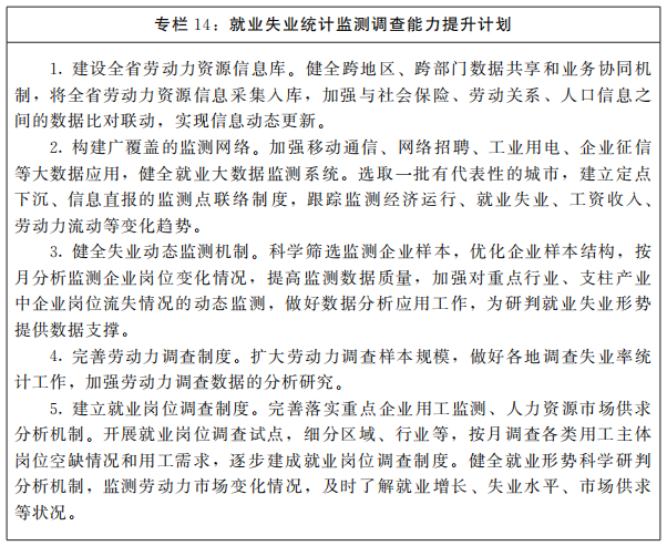 完善就业失业统计监测调查体系。加快构建系统完备、立体化的就业失业监测信息化网络,逐步实现劳动力市场、企业用工主体和劳动者个体全覆盖,全面反映就业增长、失业水平、市场供求状况。完善就业统计指标体系和调查统计方法,探索开展就业质量、就业稳定性等分析。建立省级调查失业率按月统计发布制度,推动市级调查失业率调查统计工作。建立健全城镇实名制就业、调查失业率、重点企业用工、职业供求分析、失业风险预警等指标统计监测体系,强化第三方数据质量核查,提升综合分析应用能力。推进大数据在就业统计监测领域应用。