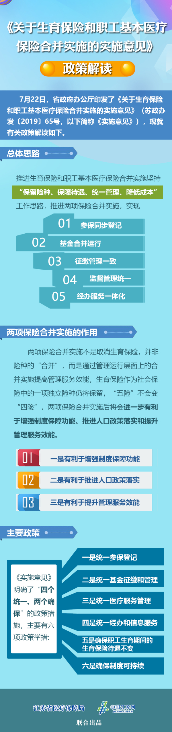 7月22日,省政府办公厅印发了《关于生育保险和职工基本医疗保险合并实施的实施意见》(苏政办发〔2019〕65号,以下简称《实施意见》),现就有关政策解读如下: