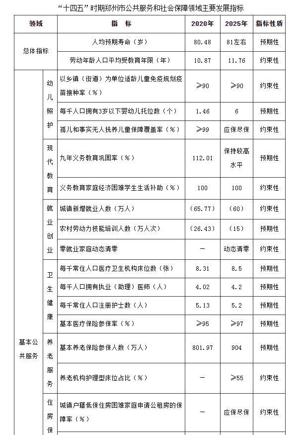 到2025年,郑州市公共服务制度体系更加健全完善,基本公共服务保障能力进一步提高,普惠性公共服务供给大幅增加,高品质多样化生活服务蓬勃发展,城乡社区服务体系建设逐步完善,基本公共服务共建共享惠及更多百姓,人民群众的获得感、幸福感和安全感明显增强,公共服务均衡化、标准化、一体化、信息化在中部地区走在前列。