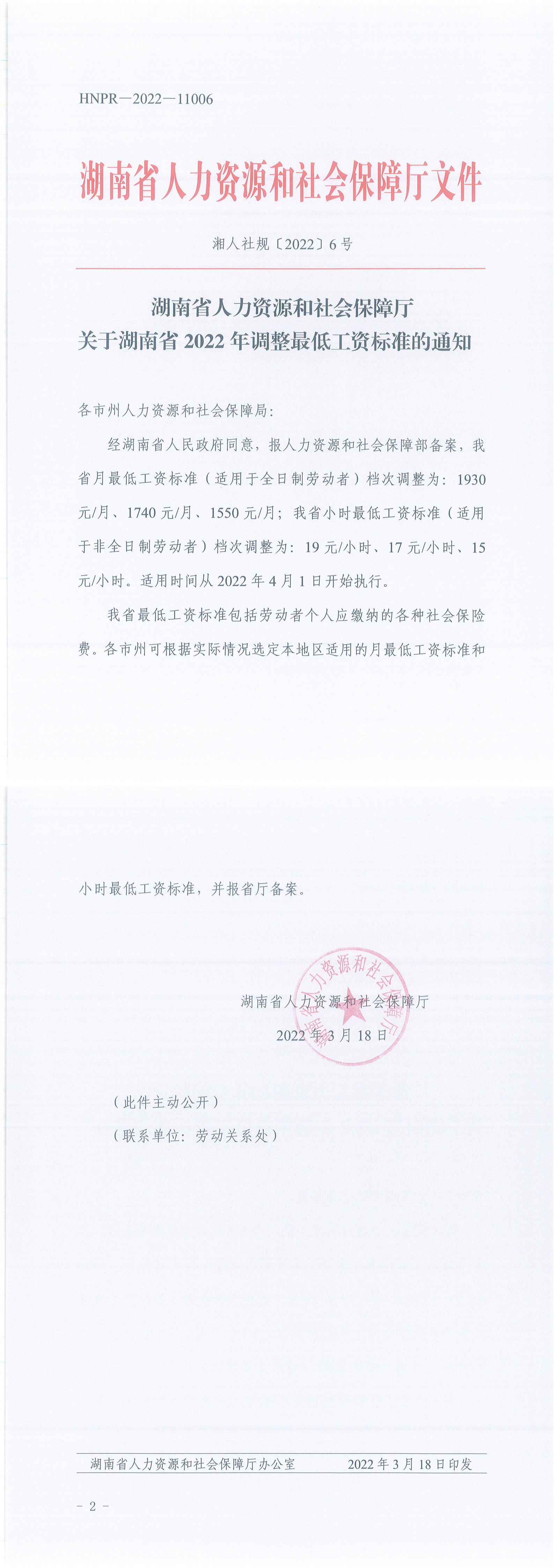 湖南省人力资源和社会保障厅关于湖南省2022年调整最低工资标准的通知