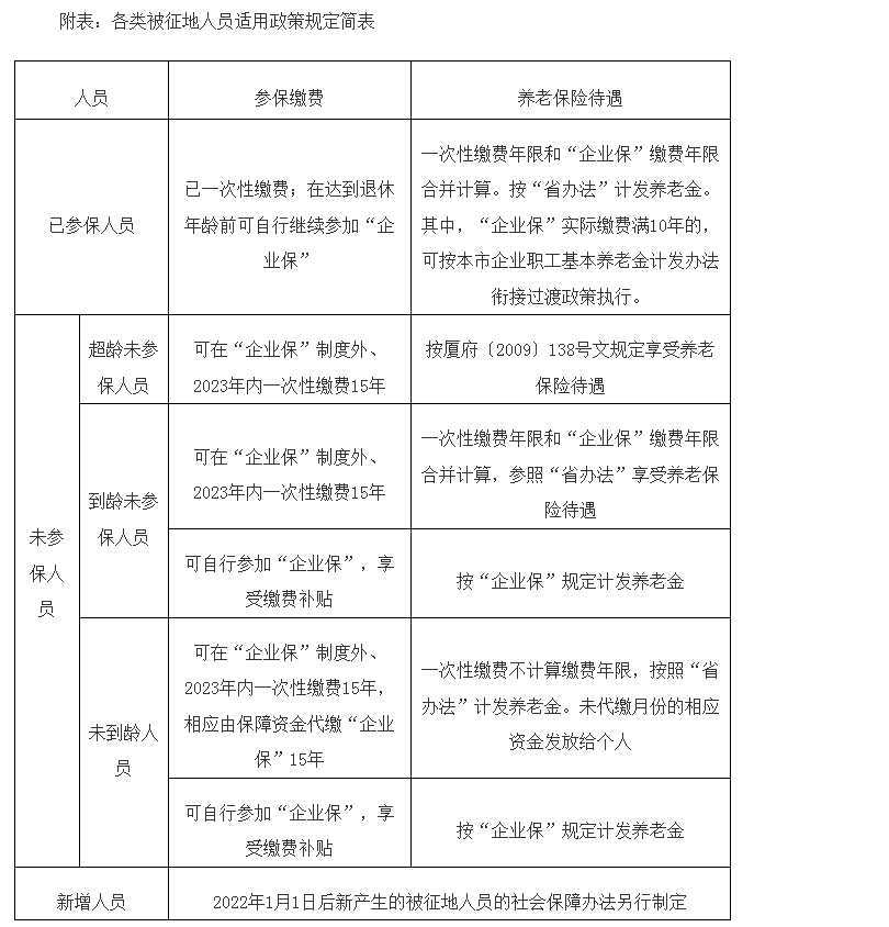 今后若国家、福建省调整“企业保”政策,本市被征地人员基本养老保险办法还将相应进行调整。