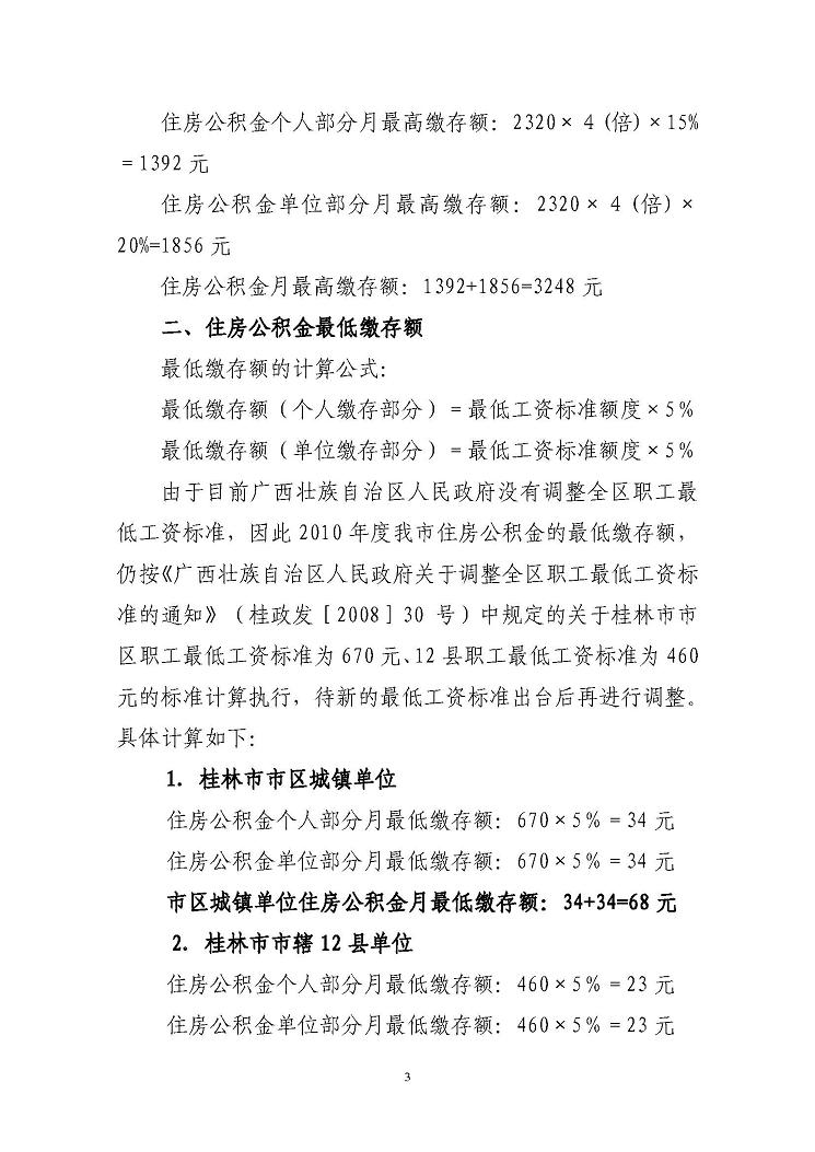 关于确定2010年度桂林市住房公积金最高缴存额和最低缴存额的通知