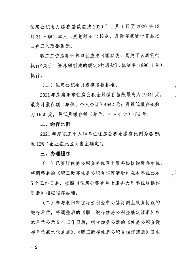 襄阳市住房公积金中心关于调整2021年度缴存基数的通知