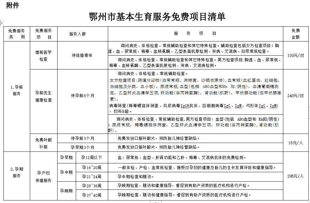 1.农村免费婚检、免费孕前优生健康检查和叶酸补服费用由专项政策资金对应支付。城镇居民的免费婚检、免费孕前优生健康检查和叶酸补服费用由市、区(葛店开发区、临空经济区)财政按5:5的比例承担解决。