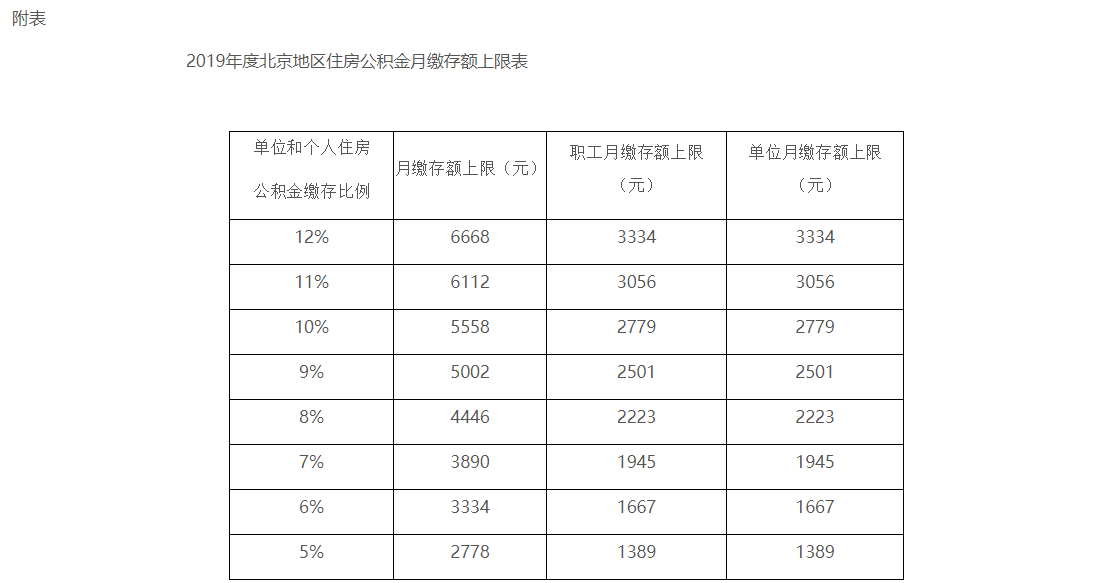 一、2019住房公积金年度北京住房公积金月缴存基数上限为27786元,具体缴存比例对应月缴存额上限见附表。
