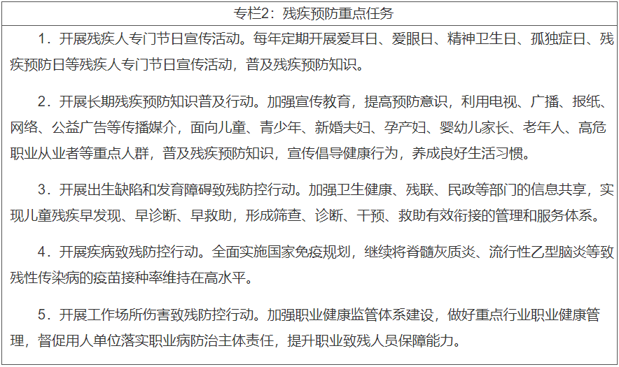 3.主要致残因素得到一定程度控制。组织开展出生缺陷、发育障碍、疾病、伤害等致残防控行动,推进慢性病、交通事故、工伤致残等重点领域的残疾预防,健全残疾预防政策,加大对重大致残疾病患者群体的救治救助。构建社会心理健康服务体系,强化重点人群心理健康服务和个体危机干预,预防和减少精神残疾发生。