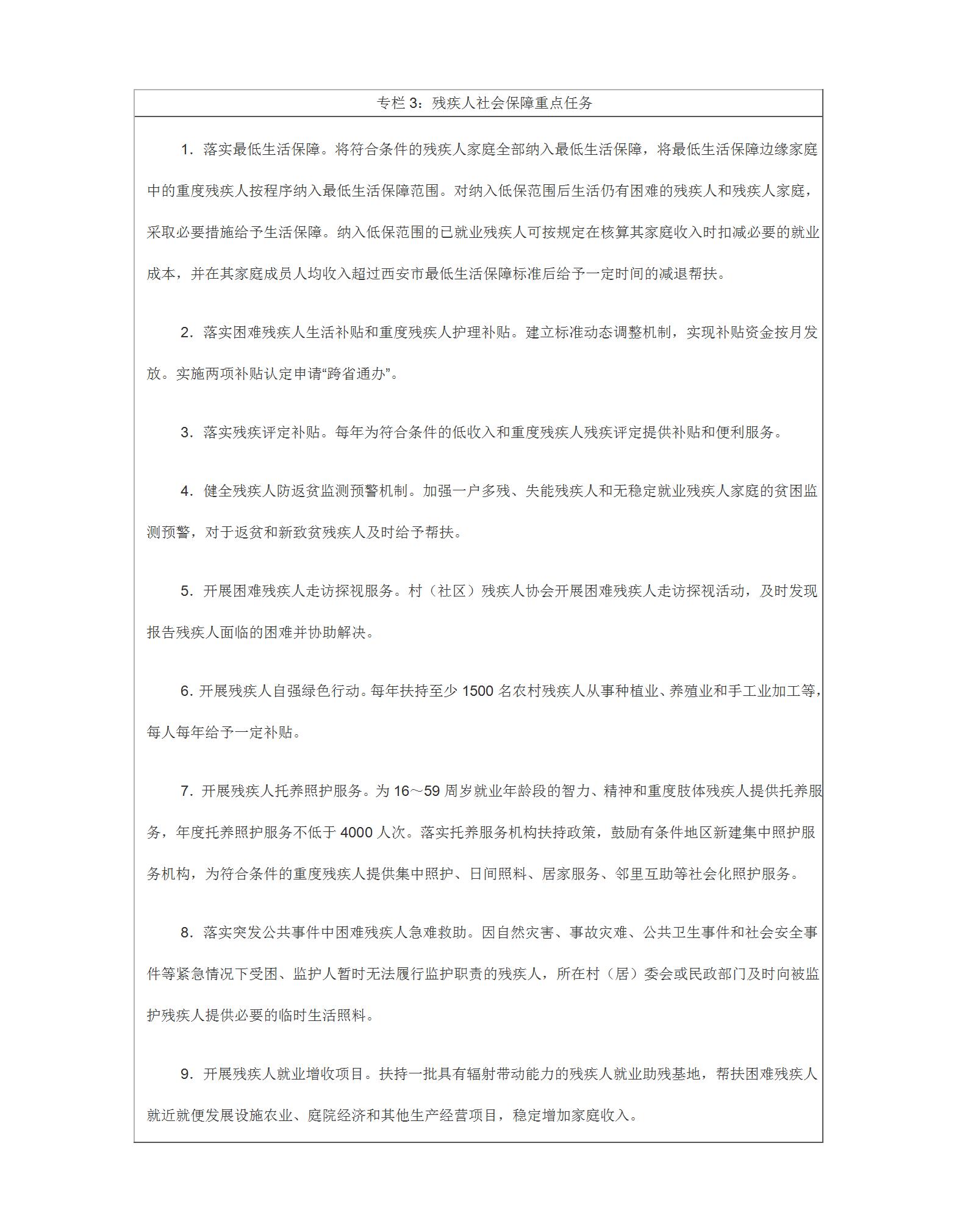 4.提升残疾人托养照护服务水平。落实《残疾人服务机构管理办法》,每个区县(含高新区、国际港务区、西咸新区)至少建设1个集中托养机构,夯实托养照护服务设施基础。对符合集中托养条件的智力、精神、重度肢体及多重残疾人提供集中托养服务,通过购买服务方式保障困难残疾人集中托养需求,年度托养照护服务不低于4000人次。对符合日间照料条件的有一定自理能力的智力、精神残疾人及多重残疾人提供日间照料服务。对符合居家托养服务条件的残疾人,通过政府购买服务,为残疾人提供居家托养服务,开展家庭康复护理、家政服务、心理健康、邻里互助等居家服务,不断拓展残疾人及其家庭特殊需求服务。推动重度残疾人照护与困难失能老人服务政策有效衔接,支持养